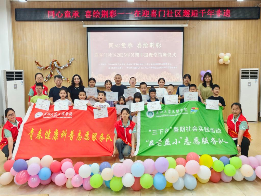 “我宣布,迎喜门社区2025年暑期‘同心童承,喜绘荆彩’非遗学堂正式结营!”在龚箐书记的宣布声中,全场响起持久的掌声。随后,学员、家长、志愿者与领导们齐聚舞台,拉起“威客电竞青春健康科普志愿服务队”与“益老益小'志愿者服务队”,在镜头前留下充满意义的大合影。