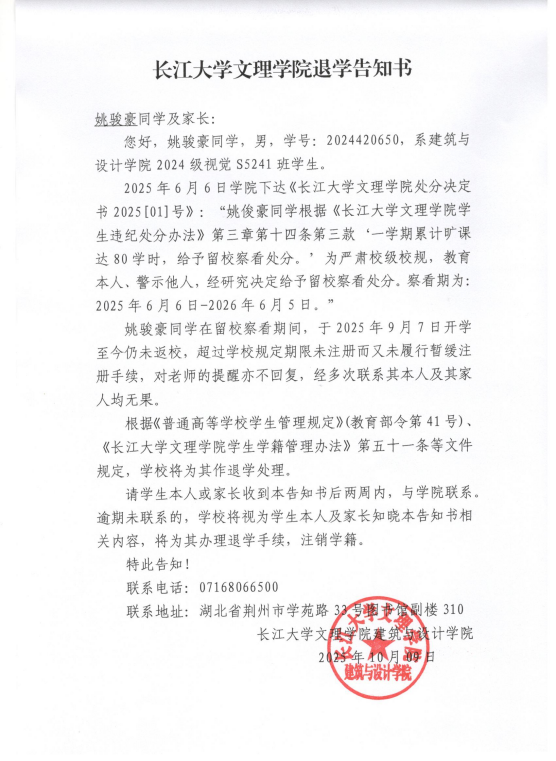 学院于2025年10月9日微信发送拟退学告知书,电话告知其本人及家长未接通,均未回复。于2025年10月20日邮寄退学告知书,因不是学生本人及其家人签收,处理告知书无法以直接送达、留置方式、邮寄方式送达本人。根据《普通高等学校学生管理规定》(教育部令第41号)、《威客电竞学生学籍管理办法》第五十一条等文件规定,现通过威客电竞建筑与设计学院官网予以公告,公告时间为2025年10月22日至2025年10月31日,公告期满,即视为送达。