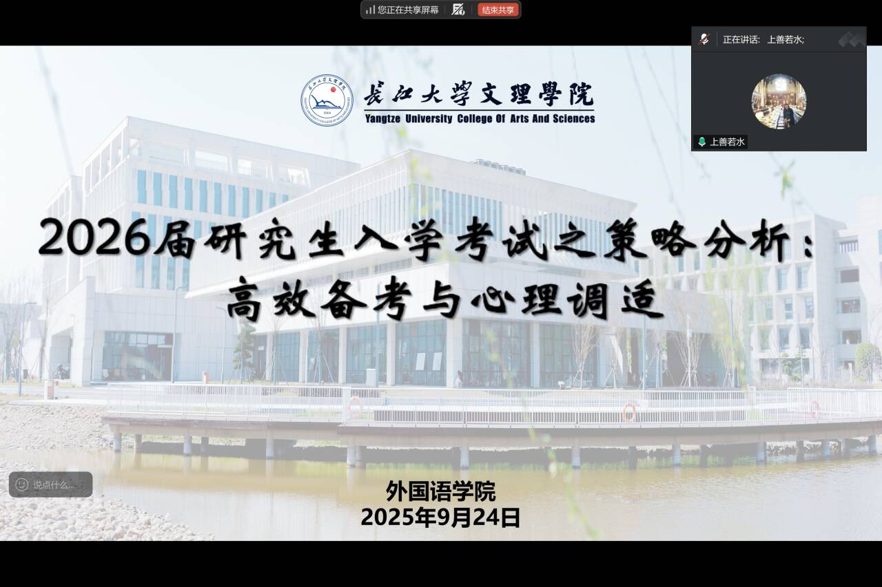 本网讯(通讯员 许静婷)为帮助考研学生明确备考方向、把握英语专业考研动态,2025年9月24日晚,我们特邀三峡大学外国语学院屈琼教授,为2026届考研学生开展了一场题为“研究生入学考试之策略分析:高效备考与心理调适”的专题讲座。讲座由外国语学院许晓艳院长主持,2026届毕业生辅导员许静婷、考研学子参加。